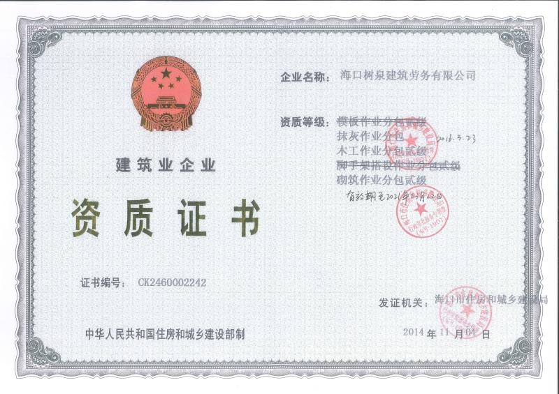 ??跇淙ㄖ趧沼邢薰境闪⒂?011年,公司位于???,其前身是一家專業建筑施工隊,自2004年即開始在海南從事建筑勞務施工。自成立至今,公司已經擁有一支科學管理、質量過硬、能打硬仗,搶工期的專業隊伍。能獨立承擔大中型工業與民用建筑 、室內外裝修、各類機電設備安裝工程。代表工程有??跒I海華庭、三亞時代海岸T01/02/04/05棟高層、合肥東?;▓@二期、陵水富力灣B區高層、三亞金中海(酒店)、瓊海大印經典花園、??诃h球海景大酒店(四星級酒店,在建中)、陵水珍珠大廈(五星酒店)、海口萬達廣場、美蘭機場二期。